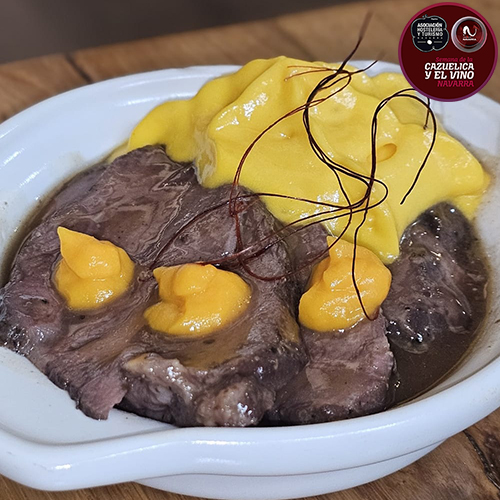 Cazuelica: Guiso de cabezada Ibérica de bellota con salsa de pimientos del picó de Navarra (apta para celíacos)  imagen para escuchar audio
